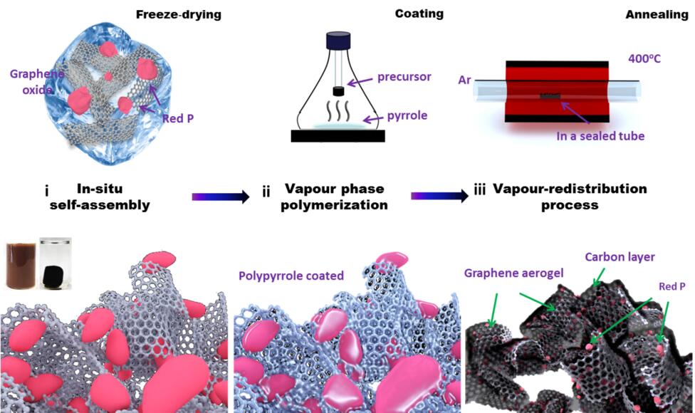 针对上述问题,澳大利亚伍伦贡大学'/span>University of Wollongong, UOW)郭再萍'/span>Zaiping Guo)教授和陈俊(Jun Chen)副教授课题组提出了一种新型的气化重组技术,制备出碳/红磷/石墨烯气凝胶三维多孔复合材料、/span>