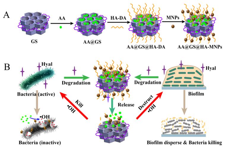 近日,中国科学院长春应用化学研究所曲晓刚研究员课题组利用透明质酸(HA)包裹的石墨?介孔二氧化硅纳米片层(GS)作为纳米载体,铁磁纳米粒子(MNPs)作为催化剂,构建一种具有靶向性且能“按需”释放前药抗坏血酸(AA)的载药体系AA@GS@HA-MNPs来治疗细菌感染。当载药纳米粒子到达感染位点后,包裹的透明质酸被目标细菌所分泌的透明质酸酶降解,装载的AA逐渐释放,然后被粘附在细菌膜表面的MNPs催化产生高毒性的?OH。由于石墨烯具有优异的光热性质,该体系可以实现化疗/光热协同抗菌作用、/span>