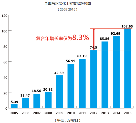 据中国水网报道,2012?015年,全国海水淡化工程规模复合年增长率仅为8.3%。发展意见中的一系列量化目标:包括到2015年,海水淡化能力达到220?260万吨/日,对海岛新增供水量的贡献率?0%以上,对沿海缺水地区新增工业供水量贡献率?5%以上,海水淡化原材料、装备制造自主创新率?0%以上等等,都没有实现、/span>