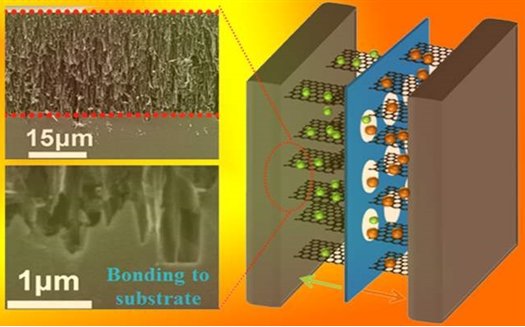 研究人员利用高温热解SiC基底方法制备出高堆叠密度、高导电、单一取向的站立石墨烯阵列。与传统电极材料相比,该阵列直接生长在导电SiC基底上,在电极材料与集流体之间形成较强的界面键合作用,并建立了有效的离子和电子传输通道。电解液离子可沿着站立石墨烯平面无障碍快速移动,有效缩短了电解液离子路径,同时,电子从石墨烯平面到集流体实现了快速传输及其存储。采用该阵列的微型超级电容器在凝胶和离子液体电解液中均表现出较高的面容量、快速的频率响应?毫秒)、优异的循环稳定性以及超高扫描速率?00V/s)。该超级电容器功率密度达?1W/cm3,理论上可为小型化、集成化电子设备提供足够的峰值功率。上述工作为发展强界面键合电极材料应用于高功率超级电容器提供了新方法、/p>
