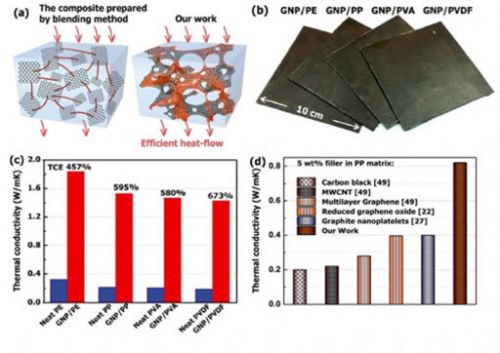 目前,中科院宁波材料所的研究人员开发了一种低成本、工艺简单、且能大规模应用的石墨烯/高分子高导热复合材料的制备方法,将高分子粉体表面均匀包裹上石墨烯纳米片,再通过热压制备成复合材料。通过此工艺,石墨烯能在高分子基底中形成胞室状的三维结构,其复合材料热导率能达到一般熔融混合法产品的两倍。这种方法适用于各类热塑性聚合物,包含对聚乙烯、聚乙烯醇、聚偏氟乙烯等,在重量百分率10%的石墨烯添加量下,能将高分子聚合物的本征热导率提??倍。这一工作有助于推动石墨烯相关高分子导热复合材料的制备及应用的发展、/p>