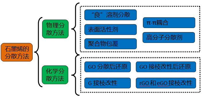 物理分散法一般分散能力有限,化学分散法虽然分散能力强,但是一般会导致共轭片层结构出现缺陷,相比较而言,非共价键修饰的官能团是一个较好的方式,基于范德华力和π-π相互作用,可以在石墨烯表面接枝比较好的高分子,这样可以避免产生缺陷及破坏片层表面的共轭结构、/span>