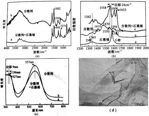 通过分散剂和石墨烯的红外、拉曼、紫外的特征峰位移证明分散剂与石墨烯之间存在π-π相互作用,通过透射电镜和原子力显微镜分析表明石墨烯在溶液中主要?/span>3~5层的纳米片层形式存在、/span>