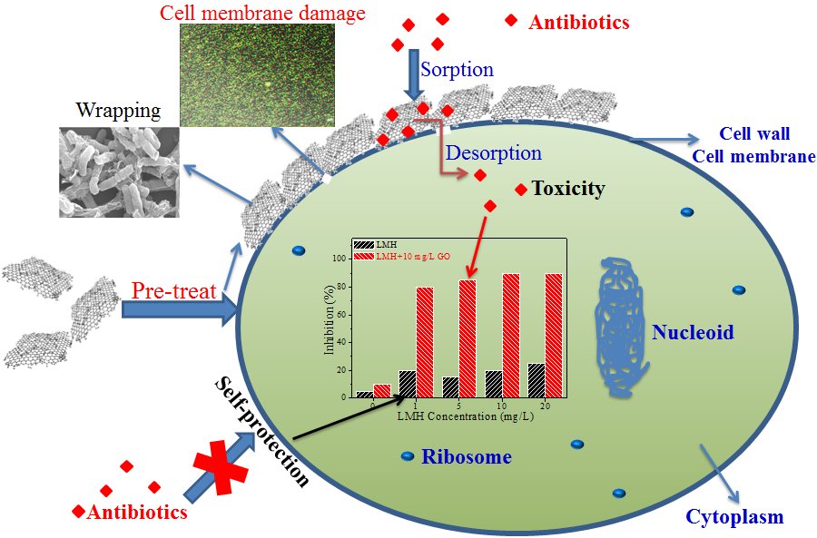 课题组进一步研究了氧化石墨烯对细菌的毒性以及对抗生素杀菌能力的影响。该研究选取了三种常见抗生素(盐酸林可霉素、氯霉素和硫酸庆大霉素)和两种细菌(大肠杆菌和金黄葡萄球菌),发现氧化石墨烯对细菌的危害取决于氧化石墨烯的浓度和接触时间,对抗生素杀菌能力的影响取决于氧化石墨烯与抗生素的相互作用力,并通过能量密度泛函理论计算研究了氧化石墨烯与三种抗生素之间的吸附能。该研究发现氧化石墨烯会破坏细菌细胞膜的完整性,而氧化石墨烯对抗生素的抗菌能力的影响取决于多种因素。如非生物因?氧化石墨烯的物理化学性质、抗生素的物理化学性质、氧化石墨烯和抗生素的相互作?和生物因?如细菌的物理化学性质、细菌对抗生素的敏感性、氧化石墨烯与细菌之间的相互作用?、/p>