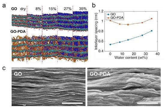 水对层间距的影响?a)不同含水量的GO和GO-PDA型号的快照。为清楚起见,PDA(DHI单位)显示为橙色,水分子以蓝色显示?b)不同含水率GO和GO-PDA的层间距(c)GO和GO-PDA论文的扫描电子显微镜图像。比例尺表示500nm、/p>