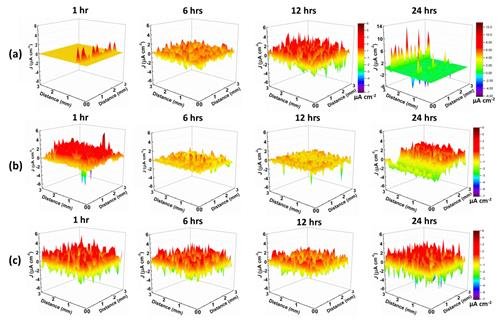 ?.(a)空白水性涂层,(b)导电聚合物复合涂层(c)石墨烯杂化复合涂层缺陷处的局部电流密度分布图