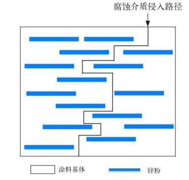 传统防腐涂料中加入径厚比较大的鳞片,分散在涂料中的鳞片交错排列,形成了独特的“迷宫”式屏蔽结构,腐蚀介质无法穿透鳞片,只能绕过其进行扩散,这种结构在涂料内部形成曲折的防扩散渗透路径,从而延长了腐蚀介质的渗透时间,提高涂层的抗渗透性与使用寿命;此外,鳞片将涂层分割成许多小间,隔开了涂层中的气泡和裂纹,改善涂层的收缩应力和膨胀系数,延缓腐蚀介质扩散和侵入基体的时间、/p>