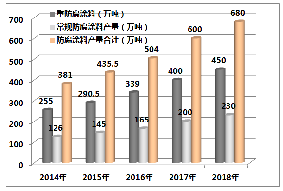 目前,我国防腐涂料的市场规模已仅次于建筑涂料而位居第二位。预计,?018年我国防腐涂料总产量将达到680万吨左右。其中尤其以重防腐涂料增长较快,发展前景可观、/p>