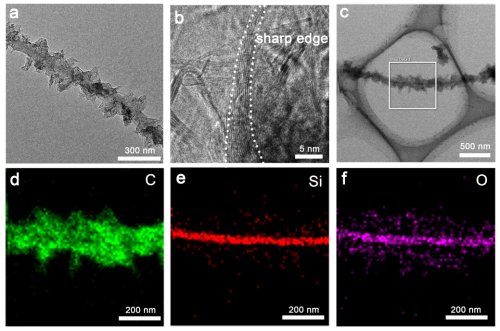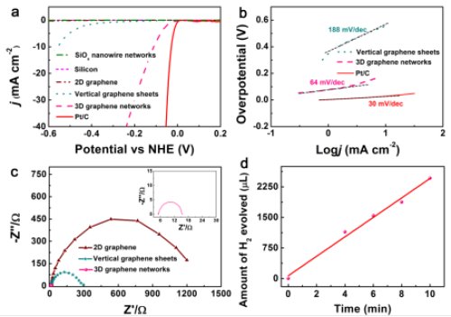 该研究所得到的三维石墨烯由高密度的直立石墨烯包覆氧化硅纳米线网络所组成,其中的氧化硅纳米线网络是通过化学气相沉积在硅基底上原位制备得到。不同于惰性的二维平面石墨烯,三维石墨烯材料中的高密度边界位点可以作为活性中心催化质子吸附与还原产生氢气。这是国际上首次提出通过对石墨烯材料的形貌调控,实现其在非掺杂、不负载助催化剂条件下的高效电催化分解水析氢。电化学测试表明,形貌优化的三维石墨烯材料电化学析氢的起始电压仅为~18 mV,与商用的Pt/C十分接近。理论研究证明,优异的析氢性能源于三维石墨烯材料丰富的尖端位点,这些高密度的边界尖端位点实现了催化惰性的本征石墨烯向高催化性能的转变。该研究为石墨烯材料在电解水析氢领域的应用提供了理论和应用基础?nbsp;