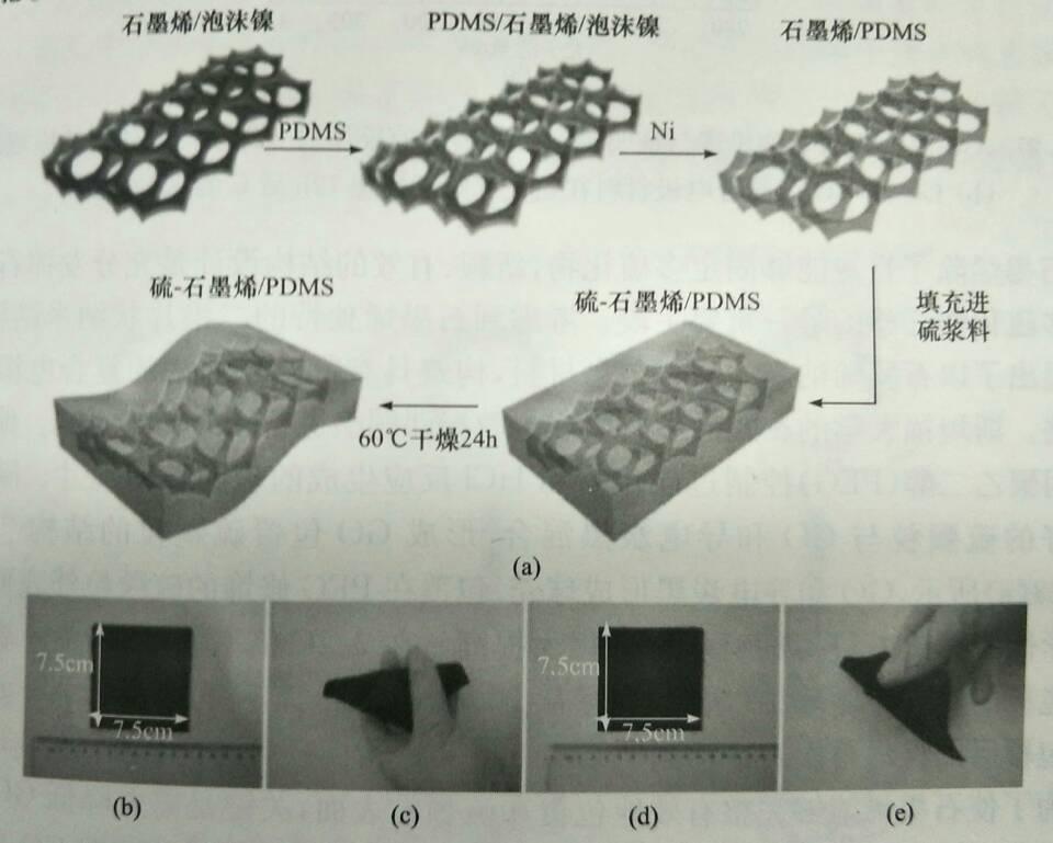 ? (a)柔性石墨烯/硫复合材料的制备流程;(b、c、d、e)石墨烯/硫复合电极材料照片及柔性展礹/strong>