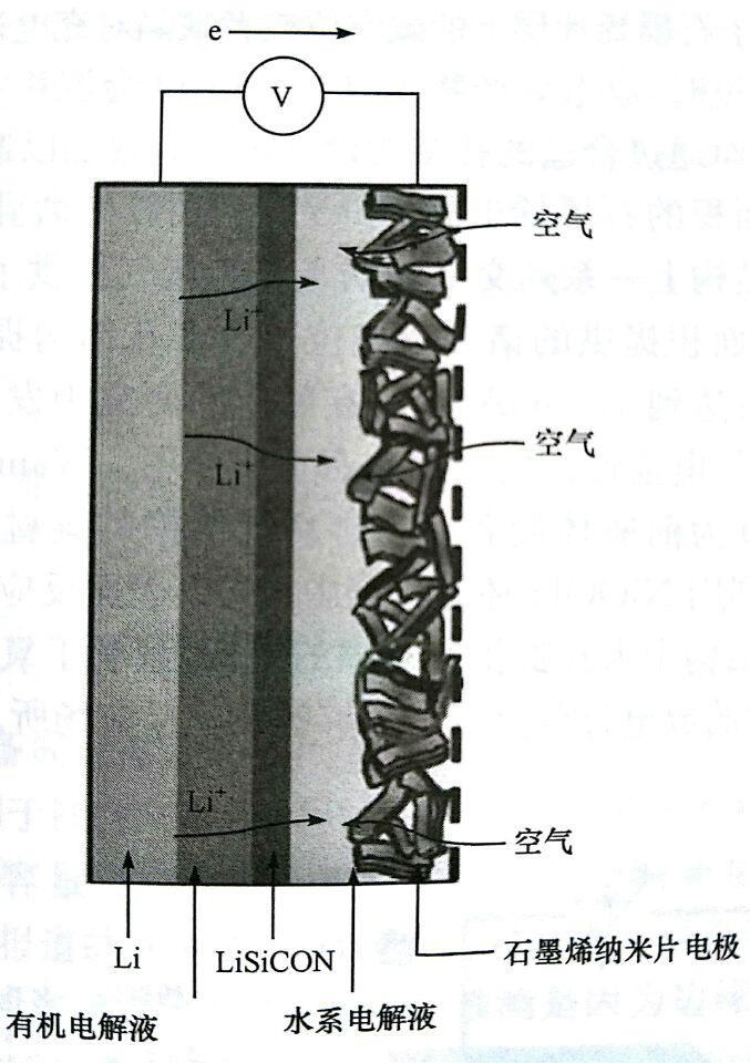另外,由于放电产物Li2O2或Li2O不溶解在有机电解液中,直接影响锂空气电池的循环性能,为了克服这一缺陷,可以设计一种新型混合锂空气电池系统(如 2 所示)金属锂与有机电解液接触,而石墨烯空气电极与水系电解液接触,有机电解液与水系电解液由一层固态电解质阻隔、/p>