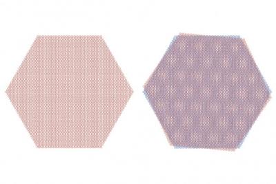 研究人员通过创建两个石墨烯薄片堆叠在一起的“超晶格”结构来实现这一性质。石墨烯薄片不是完全重合叠加,而是在一个特定的角度(研究人员称其为“魔角”),也就是旋转1.1度(如上图右侧所示)。这样就形成了精确的莫尔结构,这种结构可以使石墨烯薄片之间的电子发生强相互作用。在其他任何方式的堆叠结构中,石墨烯都很少与相邻的电子产生相互作用、/p>