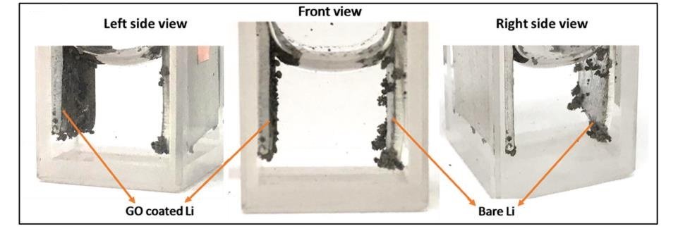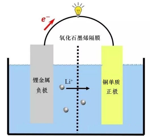 图中左侧是传统的锂金属电池铜电极? mA?cm?2循环120次后的扫描电镜图像,可以看出沉积不均匀且有锂枝晶形成;而右侧是加了氧化石墨烯隔膜的铜电极在1 mA?cm?2循环160次后的扫描电镜图像,电极表面明显更均匀更光滑、/p>