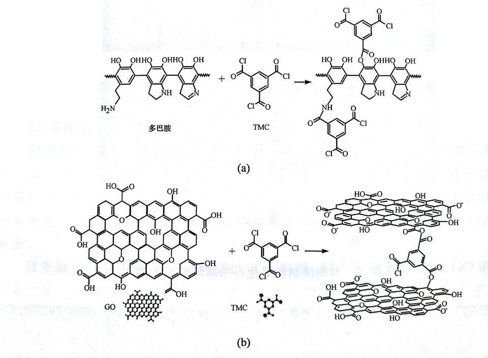 (a)聚多巴胺与TMC反应机理;(b)GO与TMC反应机理