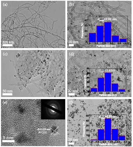 ? (a-b) Pt/CNTs的TEM国 (c-e) Pt/GNTs的TEM国 (f) Pt/rGO的TEM国/strong>