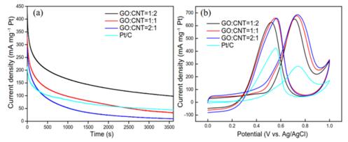 研究人员将氧化石墨烯(GO)与碳纳米?CNTs)自组装后形成一种三维结构,然后负载铂,并通过氢等离子放电可以得到具有较大比表面积的铂基三维石墨烯-碳纳米管催化?Pt/GNTs),具有优异的甲醇氧化催化性能。该技术路线综合GO与CNTs各自的优点通过自组装的方式形成三维复合结构,增大了比表面积,更有利于铂纳米颗粒的分??)。随后,科研人员在实验中制备了一系列不同GO与CNTs质量?GO: CNTs=0:1, 1:6, 1:4, 1:2, 1:1, 2:1, 4:1, 6:1?:0)的催化剂,结果发现GO: CNTs=1:2时对甲醇的催化性能最好,电流密度高达691.1 mA/mg,这个数值较商用铂碳催化剂性能提升?7.7%,并优于大部分已报道的其他催化剂,经?600s的CA测试之后仍然保持较高的电流密??)。该结果与载体的结构性能有很大关系,详细分析见原文。该研究对制备高效的甲醇氧化反应催化剂有重要意义,对三维石墨烯载体的制备也提供了一种崭新的思路、/p>