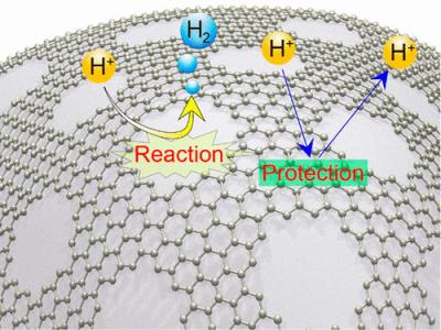 研究人员发现多孔石墨烯可以解决这个问题。他们使用氮掺杂石墨烯片来封装镍-钼(NiMo)电极合金,石墨烯含有大量纳米级的孔。研究人员表明,在酸性条件下的HER中多孔石墨烯明显优于无孔石墨烯。石墨烯在HER电极中的使用并不新鲜,这种柔性导电碳片是包裹核心金属的理想材料,不过石墨烯虽然能保护金属免受腐蚀,同时也抑制了它的化学活性。在筑波大学的研究中石墨烯的孔以两种方式促进反应,与此同时完整的石墨烯可以保护金属、/p>