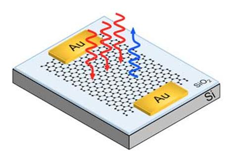 对单层石墨烯进行电场控制可以得到三次谐波,在这个过程中三个低频光子(红色)合在一起能产生一个高频(蓝色)光子,因此三次谐波的产生过程可用于制作光学变频器。(图片来源于剑桥大学的Giancarlo Soavi(/span>