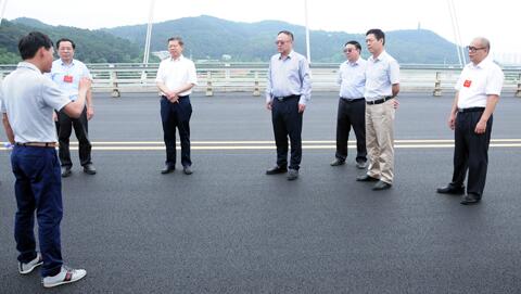 ▲广西壮族自治区政协副主席、广西大学校党委书记刘正?左三),广西科技厅党组书记、厅长曹坤华(左四)到南宁大桥考察石墨烯复合橡胶改性沥青技术的实际运用情况、/span>
