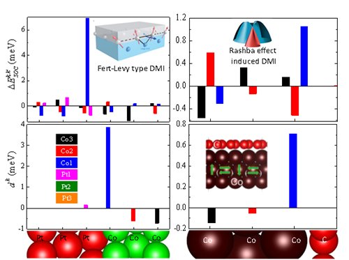 中国科学院宁波材料技术与工程研究所研究员杨洪新?012年起就开展DMI方面的工作,曾与Mairbek Chshiev教授、Andrea Thiaville教授以及诺贝尔奖得主Albert Fert等合作发展了基于第一性原理计算界面DMI的方法,成功地从第一性原理角度揭示了铁磁金属和重金属界面Fert-Levy型DMI的物理图象(如图2左)[HY et et al. Phys. Rev. Lett. 115, 267210 (2015); O. Boulle, J. Vogel, HY et al. Nature Nanotech. 11, 449 (2016)],铁磁金属与重金属界面也是当前拓扑磁结构研究最多的体系,然而,Fert-Levy机制要求非磁衬底提供强SOC才能产生较大DMI(如?左上),从而导致衬底材料的选择要多?d等重金属材料中做出,而重金属的存在,一般会影响存储器件的读写效率,并与当前工业界普遍使用的磁隧道结存储结构不兼容,使制造工艺复杂化,因而如何突破重金属的限制,即突破Fert-Levy机制实现较大DMI,成为该领域的一大难题、/p>
