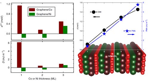 ? Co(Ni?graphene界面DMI随铁磁层厚度变化(左),graphene/Co/Ni/graphene多层膜中DMI及PMA随异质结数变化(右)