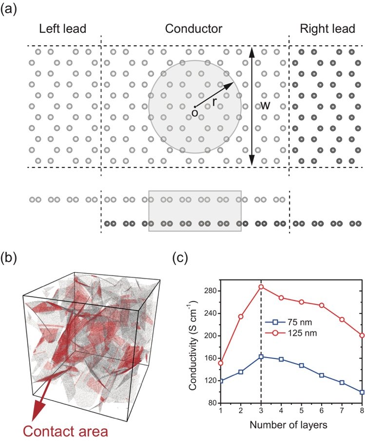 ?.理论框架?a)第一级:研究石墨烯薄片间的电导。(b)第二级:提取平均接触面积、平均接触点密度等几何特征?c) 理论计算结果表明存在电导率极大现象、/p>