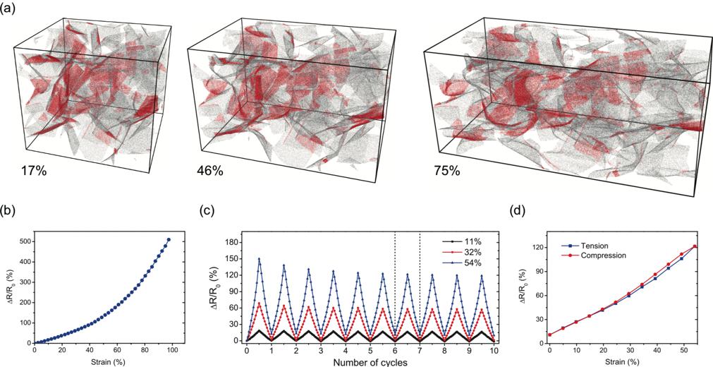 ?. 外载作用下,三维石墨烯泡沫材料的电阻变化规律。(a)不同应变下,三维石墨烯泡沫材料的结构演化。(b)电阻随应变的变化。(c)循环加载下电阻的变化。(d)第七次循环加载下电阻随应变的变化、/p>