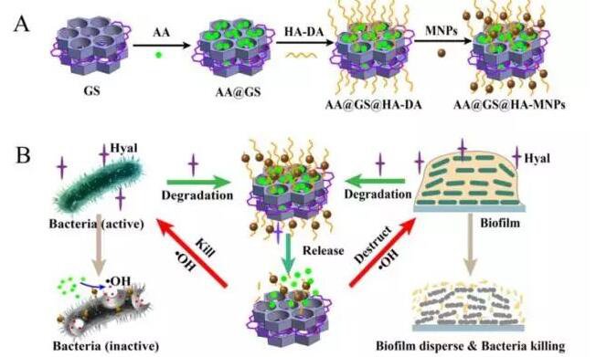 中国科学院长春应用化学研究所曲晓刚研究员课题组利用透明质酸(HA)包裹的石墨?介孔二氧化硅纳米片层(GS)作为纳米载体,铁磁纳米粒子(MNPs)作为催化剂,构建一种具有靶向性且能“按需”释放前药抗坏血酸(AA)的载药体系AA@GS@HA-MNPs来治疗细菌感染。当载药纳米粒子到达感染位点后,包裹的透明质酸被目标细菌所分泌的透明质酸酶降解,装载的AA逐渐释放,然后被粘附在细菌膜表面的MNPs催化产生高毒性的?OH、strong>由于石墨烯具有优异的光热性质,该体系可以实现化疗/光热协同抗菌作用、/strong>