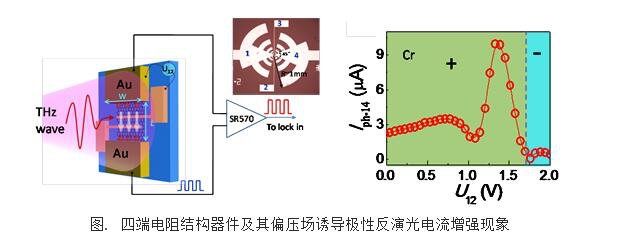中国科学院上海技术物理研究所、红外物理国家重点实验室陆卫、陈效双、王林、陈刚及合作者们避开了传统器件的设计思路,采用四端电阻结构实现对不同器件的电极互连(如图所示),研究发现了通过电极之间的互连产生类似于三极管的器件开关性能。同时,研究人员通过电极之间的偏压效应产生石墨烯沟道的非对称光电流,在偏压作用下器件光电流呈现出线性上升的趋势,产生光电流增益,对应器件响应出现数量级的提高、strong>该项研究工作将为实现便携式成像系统、人体医学太赫兹表征设备的核心器件提供崭新的途径、/strong>