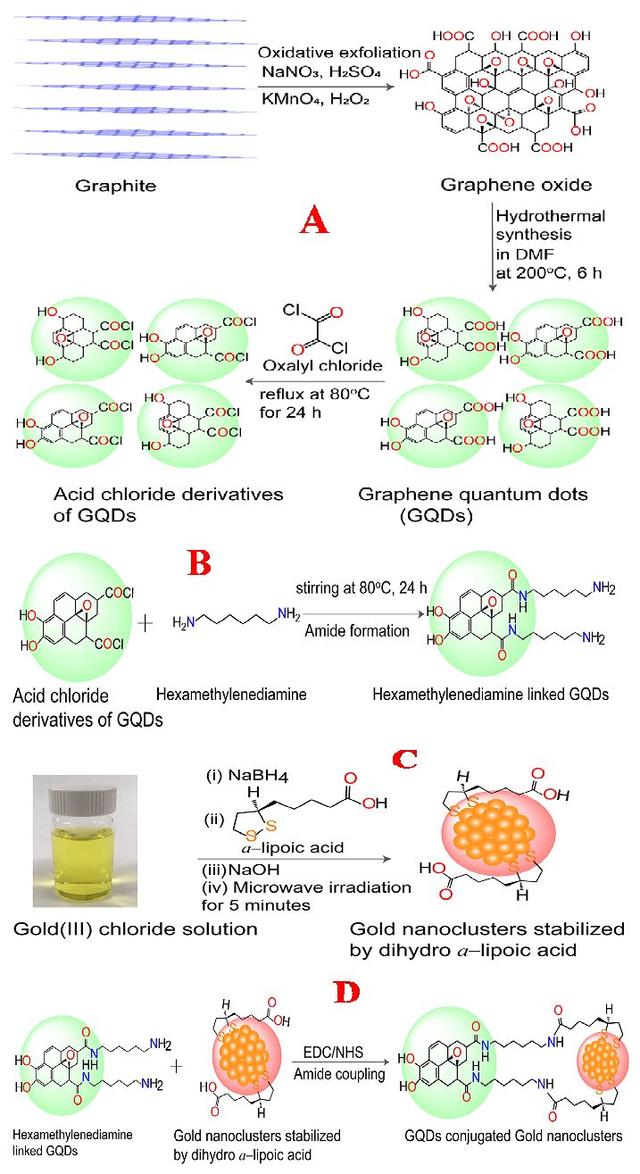在过去的十年中,人们发现新发现的石墨烯量子点(GQD)由于量子控制和边缘效应,是光电子应用领域的优秀候选者。GQDs具有良好的水溶性、缓冲性、光稳定性和生物相容性,有望成为优良的生物成像剂。研究发现,GQDs具有非常强的双光子吸收能力。另一方面,超小金纳米簇表现出一系列独特的光物理性质。一些研究小组已经证明,金纳米簇的光物理性能与其尺寸较大的纳米颗粒或母体材料的光物理性能有很大不同。由于金纳米簇具有小尺寸、近红外发射、高光稳定性和生物相容性,在生物学领域引起了广泛的关注。最新的研究成果表明,金纳米簇具有长寿命的三重态激发态,有助于产生活性氧、/p>