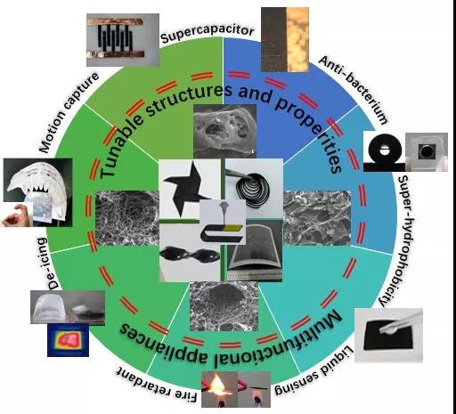 通过系统的加?结构-性能关系探索研究,该先进激光诱导GP材料具备了优异的力学、电学、压阻、焦耳热、电容、超疏水等物理化学特性,可实现如?所示的各种柔性电子器件以用于可穿戴人?机器人动作捕捉、高危液体监测、油水分离,抗菌以及具有阻燃、防/除冰、状态自感知、可低能耗在线制造的先进航空树脂基复合材料、strong>本研究提出的激光诱导石墨烯纸技术及其低成本大面积制备、性能调控与优化与多功能应用可为宏观石墨烯材料与结构的大规模制备与商业应用带来一定的指导性思路与科学意义