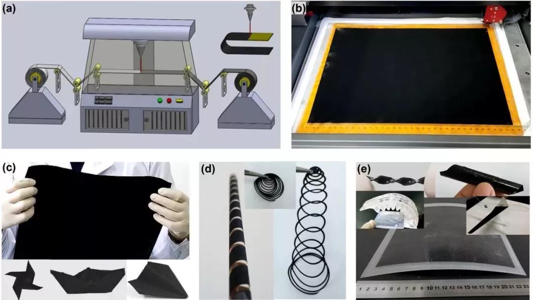 石墨烯纸(GraphenePaper, GP)作为一种超轻、超薄、高强、高导电导热的自支撑宏观二维材料,在柔性电子、智能结构、储能器件、生物医学等领域具有潜在应用。传统GP的制备主要依赖于液相组装法,其原料昂贵、工艺繁琐、加工效率低,不利于大规模制备与应用。针对上述问题,研究团队以多孔聚酰亚胺纤维聚合薄膜(PI纸)为碳源,CO2为激光源,首次利用先进激光诱导石墨烯技术(Laser Induced Graphene, LIG)制备出无基质的大尺寸石墨烯纸。研究发现,PI纸具有的特殊多孔层状纤维网络结构,可均匀吸收激光辐照的能量,并大幅度抑制石墨化过程引发的结构变形、松质、破损、失焦等加工难题,因此确保了GP材料的连续大尺寸加工。图1所展示的激光诱导单张GP材料?400平方厘米),已具有实验室级别石墨烯纸制备的最大尺寸之一。此外,该GP材料所具备的柔性与韧性保障其可通过激光二次加工实现各种多尺度复杂结构,并可以和树脂、硅胶、复合材料等先进工业材料进行进一步的一体化融合制造、br/>