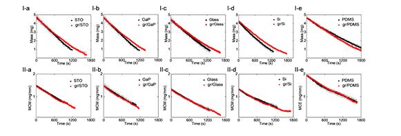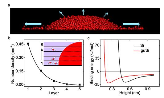 然而,令人惊讶的是,不论是否存在石墨烯,单位三相线上的平均蒸发速率几乎不会发生变化(变化率小于5%),因此石墨烯对蒸发过程来说是“透明的”。平均蒸发速率基本保持不变,是由于三相线处蒸发速率最大(相较于水滴表面)。他们通过实验研究和分子动力学模拟(图2、图3)发现:蒸发前,水分子受到固体表面的吸引,由三相线处沿着衬底向四周进行扩散,然后才以单水分子的形式脱离固体表面完成蒸发过程,而不是从水滴表面直接蒸发。石墨烯由于其单原子层厚度,对单水分子吸附能改变不大,因而表现出水蒸发过程的透明性。在垂直于衬底方向上,水分子的数目呈指数减少,对应于蒸发速率由三相线处向水滴表面呈现指数衰减、br/>