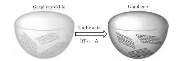 Jing采用具有强还原能力的没食子酸作为稳定剂和还原剂,制得了具有高分散性的石墨烯。由于分子中苯环结构和石墨烯之间形成了π—π共轭相互作用,从而作为稳定剂吸附在石墨烯表面,这使得石墨烯片层具有较强的负电性,阻止了石墨烯片进一步堆积在一起,使其更加难于团聚,保证了所制备的石墨烯具有较高的分散性能、/p>