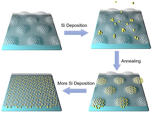 ?. 在石墨烯/Ru(0001)界面处的硅烯结构形成示意图。在退火过程中,沉积的Si原子插入到石墨烯和Ru基底之间。沉积量较小时,Si原子在石墨烯摩尔斑图atop区域(隆起的区域)下方形成蜂窝状硅烯纳米薄片。随着Si沉积量的增加,插层结构形成硅烯单层结构、/p>