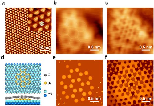 ?. 硅烯纳米薄片阵列的STM图像及理论模拟。(a)STM形貌显示Si插层后的石墨?Ru(0001)结构。插图为(a)的放大图像。(b,c)分别为?0.5 V?0.1 V偏压下在相同区域得到的硅烯和石墨烯的原子级分辨率图像。(d)在石墨烯摩尔晶格atop区域下方插层26个Si原子组成的硅烯薄片的原子结构模型。(e,f)分别为(d)中的模型在-0.5 eV?0.1 eV下通过第一性原理计算模拟的STM图像,与实验观测到的一致、br/>