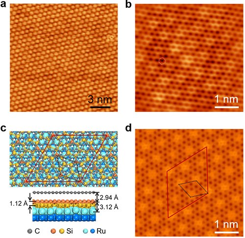 ?. 单层硅烯的STM图像及理论模拟。(a)石墨烯/硅烯异质结构生长在Ru(0001)表面的STM图像。(b)表层石墨烯晶格的原子分辨率图像。(c?7×7)Ru(0001)/(?1×?1)硅烯/(8×8)石墨烯异质结构模型的顶视图和侧视图(超晶格元胞由红色菱形标记)。(d)(c)中构型的第一性原理模拟STM图像、br/>