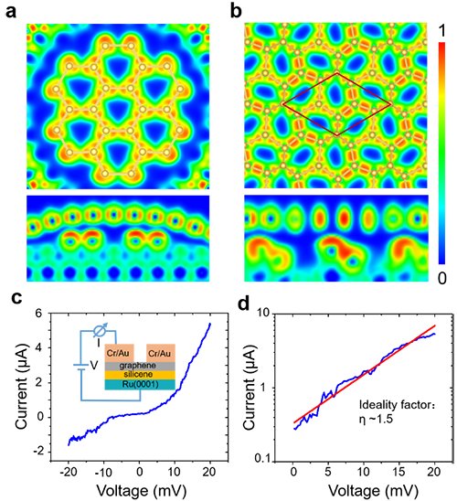 ?. 石墨?硅烯异质结构的电子局域函数(ELF)计算和输运特性。(a,b)硅烯纳米片和单层硅烯在硅原子平面的电子局域函数(ELF)分布图。c)在105 K下测量的石墨?硅烯/钌垂直异质结构的电流-电压曲线,显示典型的肖特基型整流行为。插图是器件结构和测量的示意图 d)伏安曲线的对数图。通过将其与Schockley模型拟合得到的理想因子为1.5、br/>