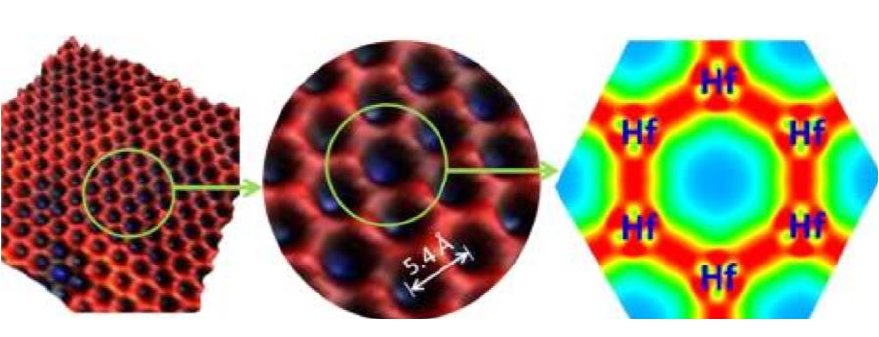 2013年,李林飞等人发现了制备铪烯二维原子晶体的方法。他们选用Ir(111)基底,利用电子束蒸发源将金属铪沉积到表面,通过后续退火理得到了规则有序结构。结合STM和LEED表征以及DFT计算,他们确认了单层平面二维蜂窝状的铪烯结构、/span>