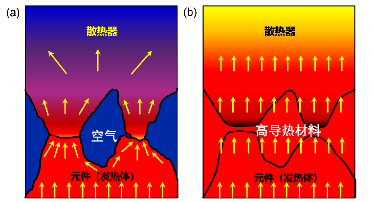 热界面材料填充于固体表面缺陷之间的界面间隙,有效地排除空气,使得产热元器件与散热器件之间的接触更加密切,大大降低了界面接触热阻,建立起了高效的热传递通道,从而使得散热器件的工作效率得到了最大化的提升、/p>