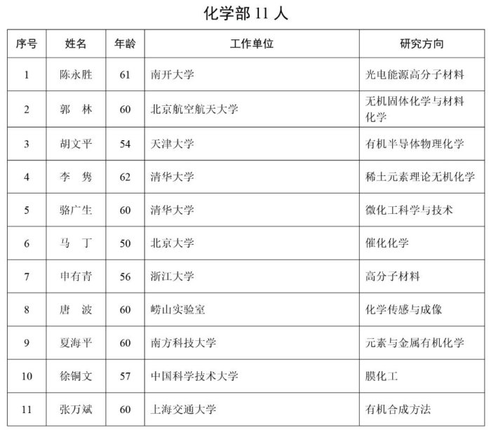 中国粉体网讯11朇span style="font-family: arial, helvetica, sans-serif; text-align: center;">21日,2025年两院院士增选结果正式揭晓,共有144人当选。其中,共选举产生中国科学院院?3人,选举产生中国工程院院?1人、/span>今天我们盘点一下中国科学院化学?1位院士,他们分别是:陈永胜、郭林、胡文平、李隽、骆广生、马丁、申有青、唐波、夏海平、徐铜文、张万斌、/span>恭喜各位老师?/strong>