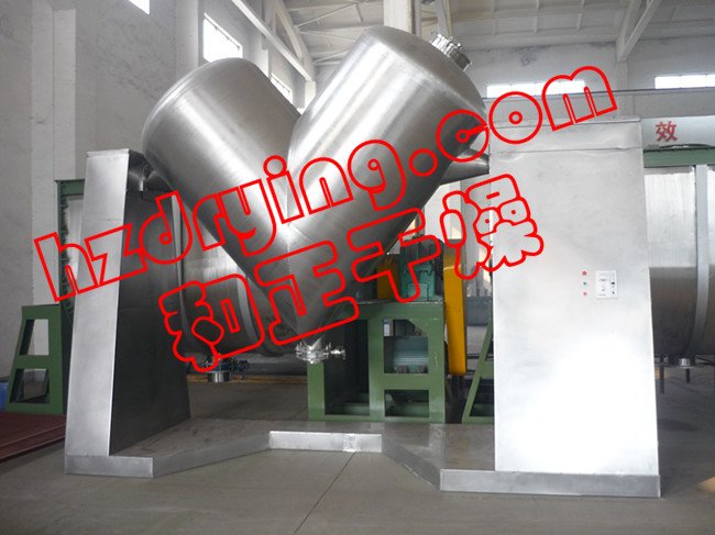 V型筒体在驱动轴的带动下绕回转轴中心作旋转运动,其中的物料也随着V型的两个倾斜筒体作重力扩散运动,当V型筒体的连接处(底部)旋转位于下部位置时,物料向底部汇聚。而当V型筒体的连接处旋转位于上部位置时,汇集在底部的物料被分流到两个斜筒体内,使得每个斜筒体的物料又可以经联接口进入另一个斜筒内。随着筒体的不断旋转,位置的不断改变,V型筒体的物料被反复错位,平移,扩散,从而实现均匀混合、/span>