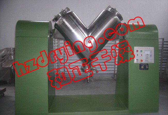 V型筒体在驱动轴的带动下绕回转轴中心作旋转运动,其中的物料也随着V型的两个倾斜筒体作重力扩散运动,当V型筒体的连接处(底部)旋转位于下部位置时,物料向底部汇聚。而当V型筒体的连接处旋转位于上部位置时,汇集在底部的物料被分流到两个斜筒体内,使得每个斜筒体的物料又可以经联接口进入另一个斜筒内。随着筒体的不断旋转,位置的不断改变,V型筒体的物料被反复错位,平移,扩散,从而实现均匀混合、/span>