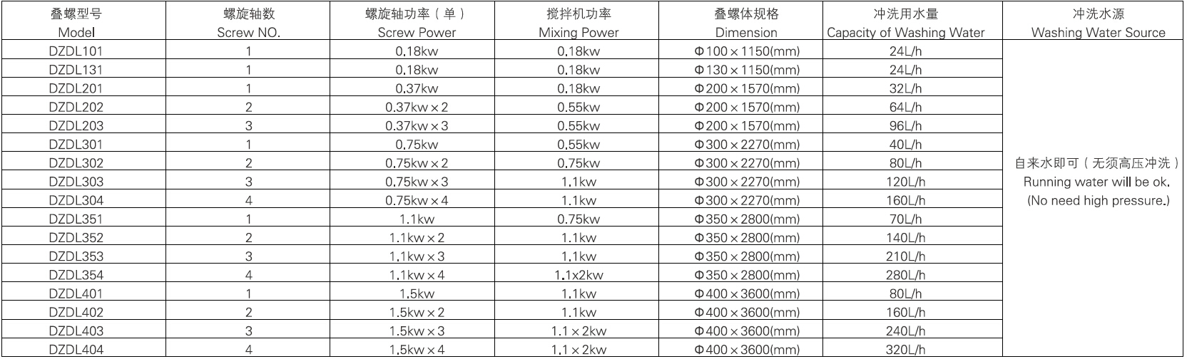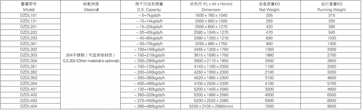 叠螺体包括若干相互叠置的固定环,固定环的外周均布有多个螺杆,固定环套装在螺杆上,螺杆上位于相邻两固定环之间套置有垫圈,相邻固定环之间的间隙中还设置有游动环,固定环的内侧与螺旋叶片间隙配合。工作时,游动环随螺旋轴(主轴)的转动而游动,垫圈使得固定环和游动环之间始终能保持一定的间隙,避免完全堵死,具有自清作用,无需为防止滤缝堵塞而进行大量清洗,彻底减少了冲洗用水量。高效污泥挤压技术:为了进一步降?终滤饼的含水率。我们采用了独特结构9br/>一:是螺旋叶片的螺距从进泥箱向排泥箱方向上逐渐减小,同时螺旋轴靠近排泥箱一侧设有一段变径段,变径段的直径从进泥箱向排泥箱方向上逐渐变大、br/>二:是在主轴上,位于排泥箱内设有阻泥板,阻泥板与脱水筒之间留有间隙。阻泥板的设置可阻挡污泥,使脱水筒内的污泥具有一定的压力,可将污泥中的水充分挤出,达到更好的脱水效果、br/>三:叠螺体自清洗技术是螺旋叶片的表面硬化处理技?在螺旋轴叶片外径上利用低温超音速技术进行表面喷涂硬质材料,使表面硬度达?000HV,附着力大?0MPa,工件变形小,减少了对螺旋轴叶片的磨损,延长了叠螺体的使用寿命。一般部件采用裁板机或者水刀切割,关键部件纯激光下料,保证设备高精确度、/p>