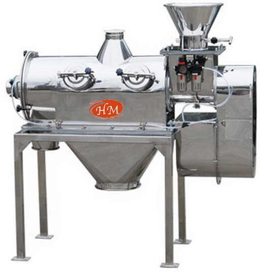 卧式气流筛(气旋筛)筛网为圆筒状,置于机体内,物料通过螺旋输送系统后,和气流混合、雾化进入网筒内;通过网筒内风轮叶片使物料同时受离心力和旋风推进力,从而迫使物料喷射过网,由细料排出口排出,不能过网的物料沿筒壁从粗料排出口排出、/span>
