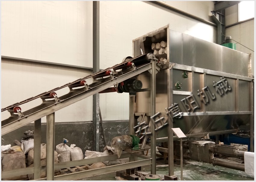 袋装粉粒体物料由皮带输送机传送至45度角的滑板上并依靠重力沿滑板下滑,在下滑过程中由快速转动的刀片将包装袋割开,被割开的残袋和物料滑入滚筒筛进行筛分。从滚筒筛落下的物料由螺旋输送机输出,破损的包装袋、杂质、结块物料被滚筒筛带出机体。割刀破袋过程中引起的粉尘由布袋式除尘器捕捉并抖落入螺旋输送机(由螺旋输送机输出的物料可通过我公司的管链输送机或者气力输送装置,输送至至物料储罐中)、/span>