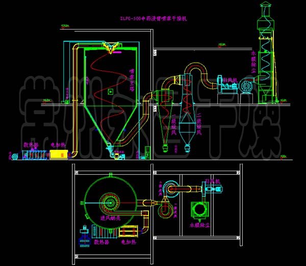 ▲中药浸膏高速离心式喷雾装置是离心式喷雾干燥技术在特定物料干燥中的应用,也是利用高速离心式雾化器使物料分散成细,与热空气充分接触,完成瞬间干燥,形成粉状成品的干燥装置。该干燥设备是专门用来解决中药浸膏和植物提取液的喷雾干燥机,它有效地解决了原LPG高速喷雾干燥机在中药浸膏干燥中出现的粘壁、焦化、收粉率低、产量低等问题