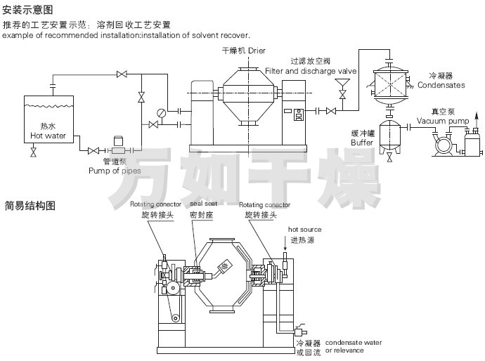 ◎油加热时.采用自动恒温控制.可以干燥生化制?br/>◎和矿物原料,温度可?0?60oC之间、br/>◎热效率高,比一般烘箱提?倍以上、br/>◎间接加热.物料不会被污染,符合“GMP”要求。设备维修操作简便,易清洗、br/>◎推荐的工艺安置示范溶剂回收工艺安置、br/>适应物料