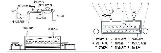 DWP型属喷射气流带式干燥类型,热风以狭缝流或孔束流向下或上下同时喷向输送带上的物料,由于喷射气带高?5m/s以上,故对流传热的传热膜极薄,传热系数大,干燥速度快。该设备用于不透气类物料时,上面喷射气流仍返回上面,下面喷出的气体仍返出下面,再参与循环。对透气性物料如涂膜布干燥等,也适用于片状物料及一些特殊物料的干燥。如果采用双向气流喷射,板材之类物料干燥后变形小。喷射气流干燥使用热源可以是蒸气、电、热风炉及燃油烟道气等、br/>