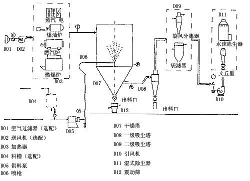 本机组是一种可以同时完成干燥和造粒的装置。按工艺要求可以调节料液泵的压力,流量,喷孔的大小,得到所需的按一定大小比例的球形颗粒、br/> 本机组工作过程为料液通过隔膜泵高压输入,喷出雾状液滴,然后同热空气并流下降,大部分粉粒由塔底排料口收集,废气及其微小粉末经旋风分离器分离,废气由抽风机排出,粉末由设在旋风分离器下端的授粉筒收集,风机出口处还可装备二级除尘装置,回收率?6-98%以上、br/> 本机组与物料接触部分的塔体、管道、分离器的材料,均采用SUS304制作。在塔体内部与外壳之间有足够的保温层,填充材料为超细玻璃棉,塔体设有观察门、视镜、光源及控制仪表,由电气控制操作台控制和显示、br/> 本机组的热源装置采用蒸汽加热或电加热器,具有操作方便、启动快、结构紧凑、热风干净清洁等优点。另外在电气控制柜内装有电加热器的控制调节装置,使进口温度无级调节。对于缺电地区可采用蒸汽加热或燃煤、燃油热风炉等方式,局部或全部代替电加热装置。本厂可提供根据用户的实际需要的各种加热方式、br/>